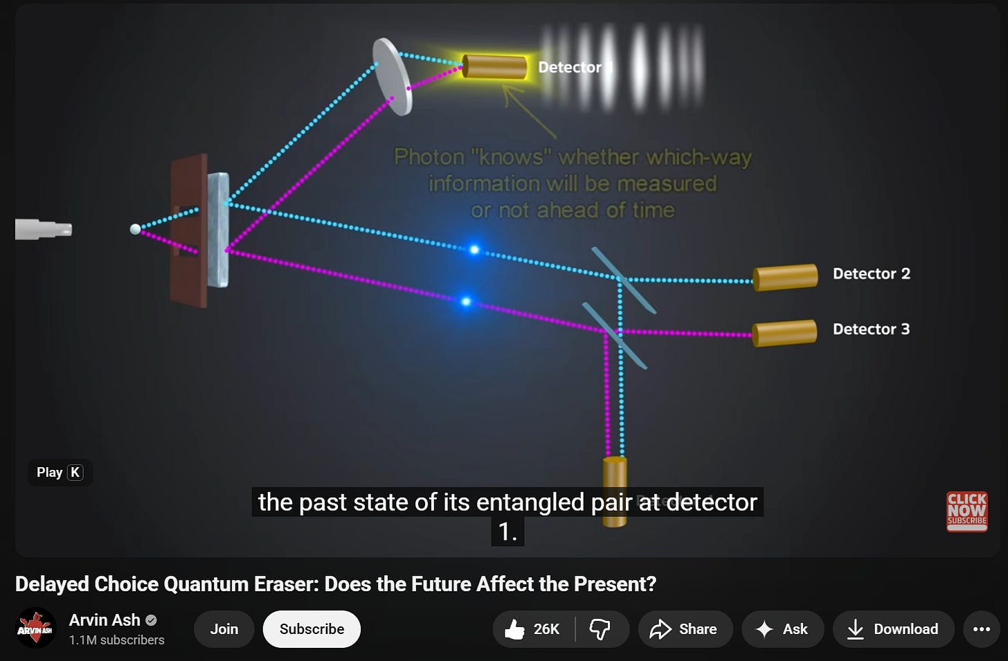 Arvin Ash, Youtube: “Delayed Choice Quantum Eraser: Does the Future Affect the Present?” https://youtu.be/0ui9ovrQuKE?si=ly8GOiBtZK7Qplp_